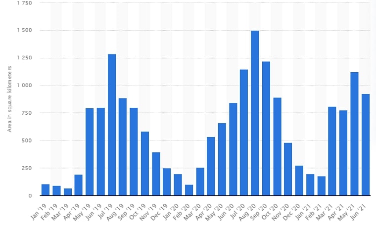 From Statista, showing monthly deforested area of the Amazon rainforest in Brazil from 01/19 to 06/21