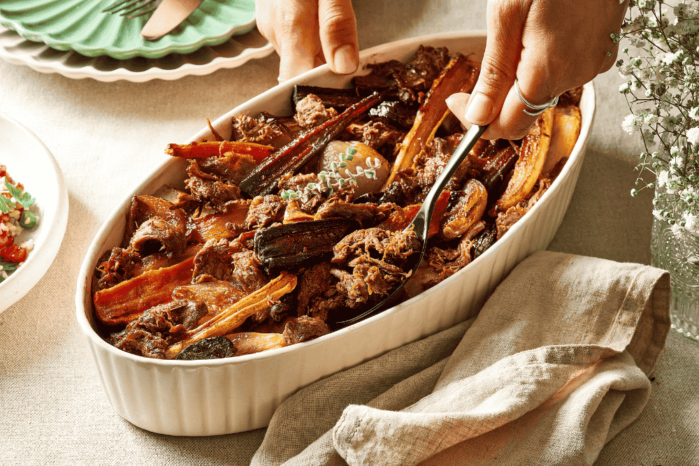 1. במחבת רחבה (שמתאימה לתנור) צורבים את הבשר המפורק כ- 10 דקות עד שמקבל צבע חום כהה ומרקם קריספי. מוציאים לצלחת ומניחים בצד.