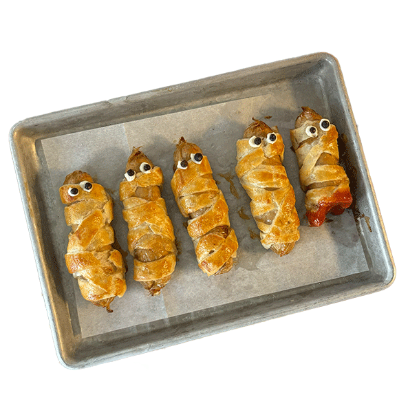 3. Roll out the shortcrust pastry and place half of it in a round baking dish with a diameter of 20-22 cm. Set aside the second half for the pie cover, cutting out spooky shapes to decorate.